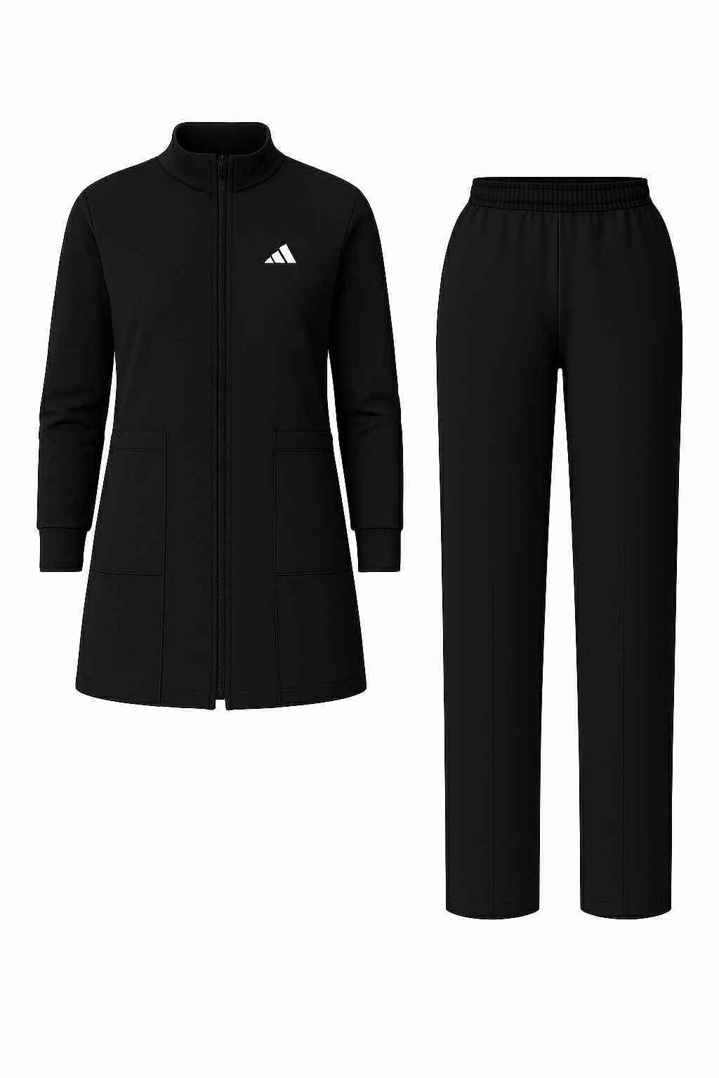 - سحاب أمامي كامل + بنطال بقصة مريحة ومحتشمة.