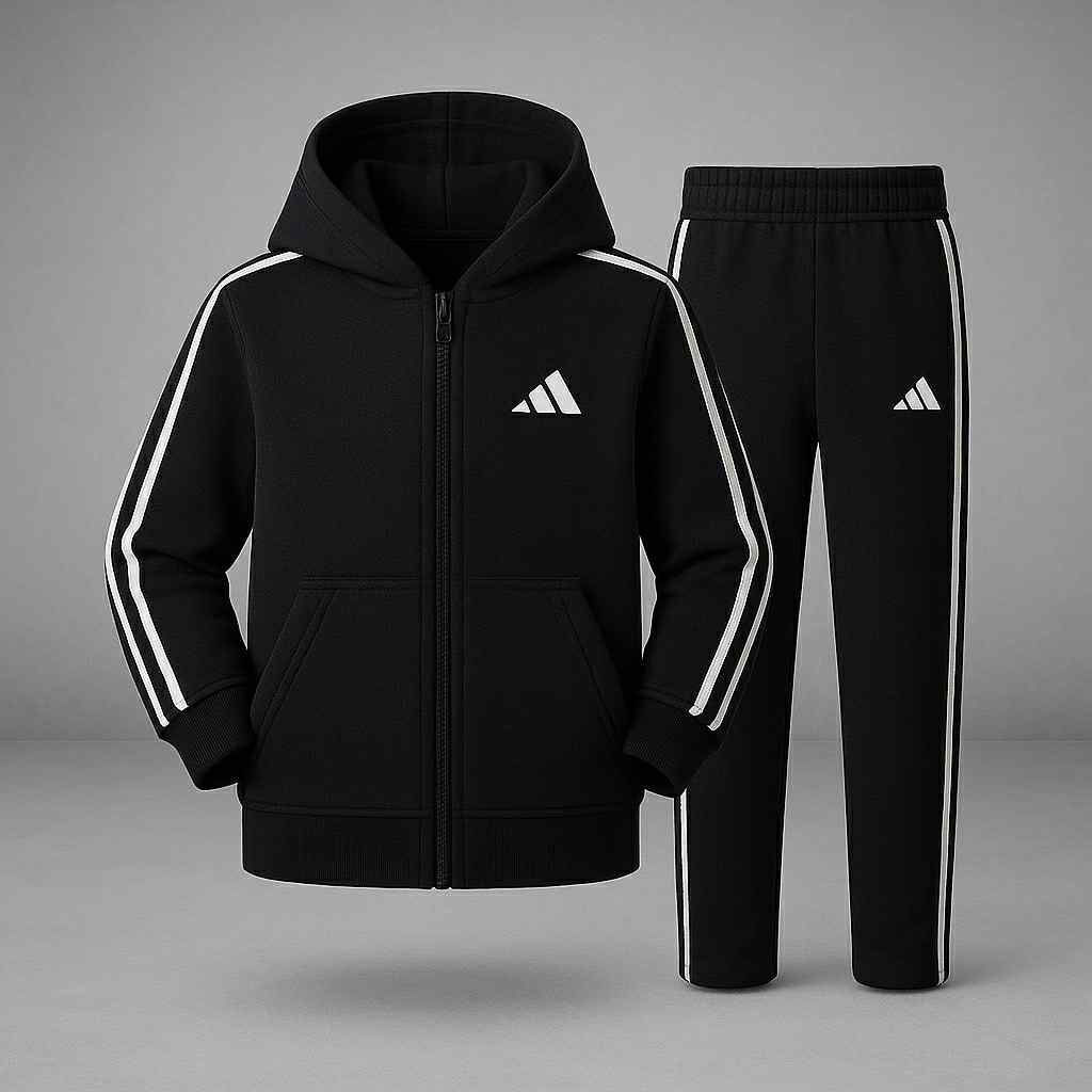 بدلة ولادي أنيقة ومريحة مصممة خصيصًا للأطفال بعمر 4 إلى 12 سنة، بخامة قطن خريفي ناعمة، وسحاب أمامي مريح، مع خطوط جانبية تضيف لمسة رياضية راقية وشعار مطرّز بجودة عالية.
